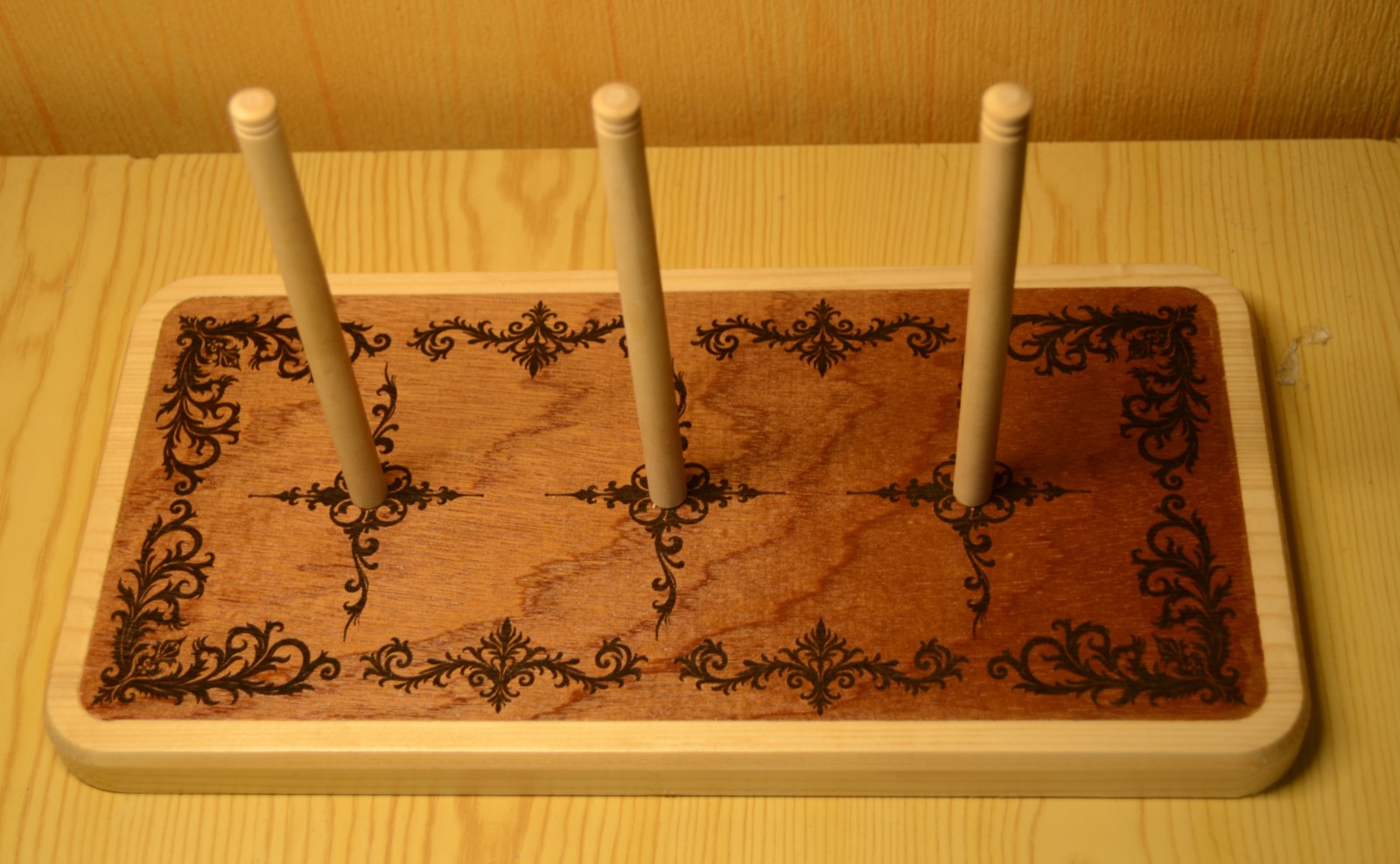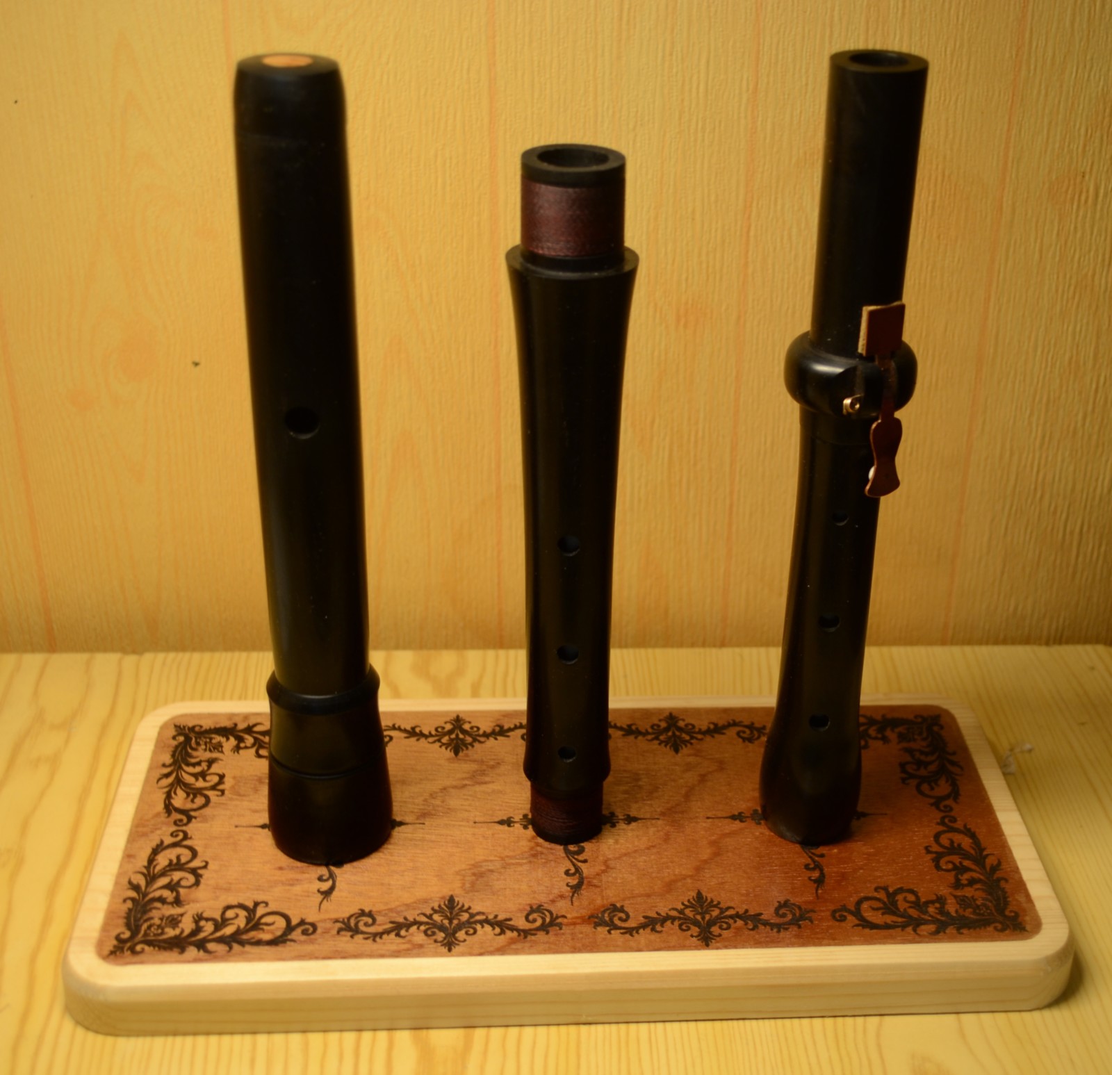 Ce support en bois a été spécialement conçu pour accueillir un traverso baroque démonté, en alliant fonctionnalité, esthétique et respect de l’instrument.